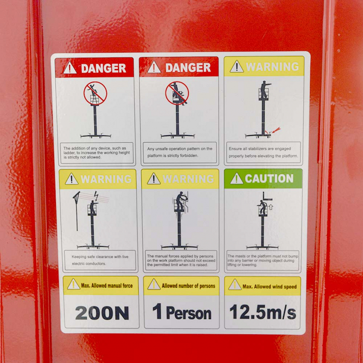 Раздвижная алюминиевая мачта приводится в действие гидравлической системой с электроприводом мощностью 0,75 кВт. В качестве источника энергии используется сеть переменного тока с напряжением 220 В. Передвигается этот телескопический мачтовый подъемник вручную. Благодаря компактности, он удобен для использования внутри зданий, что делает его хорошей альтернативой стремянкам, передвижным вышкам и подмостям.
